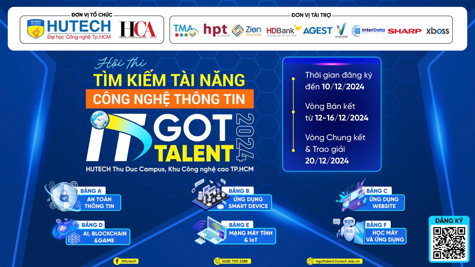 IT Got Talent 2024 trở lại lần thứ 9 với sự đồng hành của 9 nhà tài trợ lớn như Sharp VN, TMA, HPT, HDBank, AGEST VN, XBoss, Zien Solution, Inter Data, Viet Japan Partner cùng hơn 20 chuyên gia uy tín trong Hội đồng Giám khảo. Cuộc thi năm nay được thiết kế với 6 bảng thi đa dạng, mở rộng cơ hội cho tất cả sinh viên từ trung cấp, học sinh THPT đến đại học trên toàn quốc.