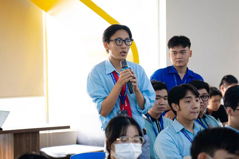 Bên cạnh đó, sinh viên khoa Công nghệ Thông tin đã đặt nhiều câu hỏi liên quan đến kiến thức chuyên môn, xu hướng nghề nghiệp và kỹ năng cần thiết để làm việc tại các doanh nghiệp công nghệ hiện nay. Những chia sẻ cởi mở, chân thực từ các diễn giả đã góp phần truyền cảm hứng, định hướng rõ ràng và tạo động lực học tập – nghiên cứu cho sinh viên.
