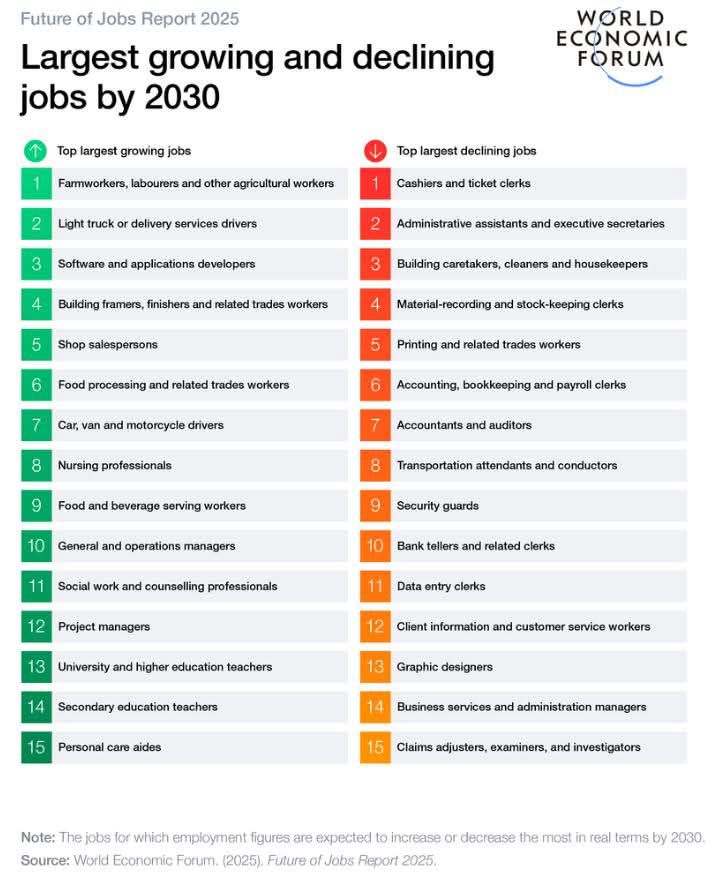 Báo cáo "Future of Jobs Report 2025" của Diễn đàn Kinh tế Thế giới đã chỉ ra những ngành nghề sẽ phát triển và suy giảm đến năm 2030. Cùng mình điểm qua nhé!